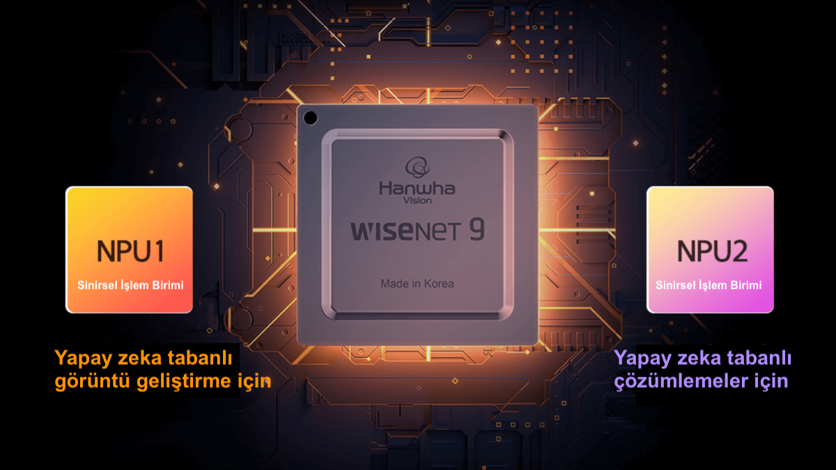 Wisenet 9’un yapay zeka motoru, Çift NPU ile güçlendirilmiştir. Bu yapı, video kalitesi ve çözümleme (analiz) işlemlerinin bağımsız kaynaklar kullanmasını sağlayarak, bir fonksiyonun diğerini etkilemesini engeller ve maksimum performans sunar.